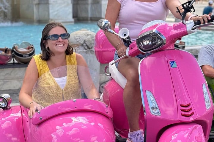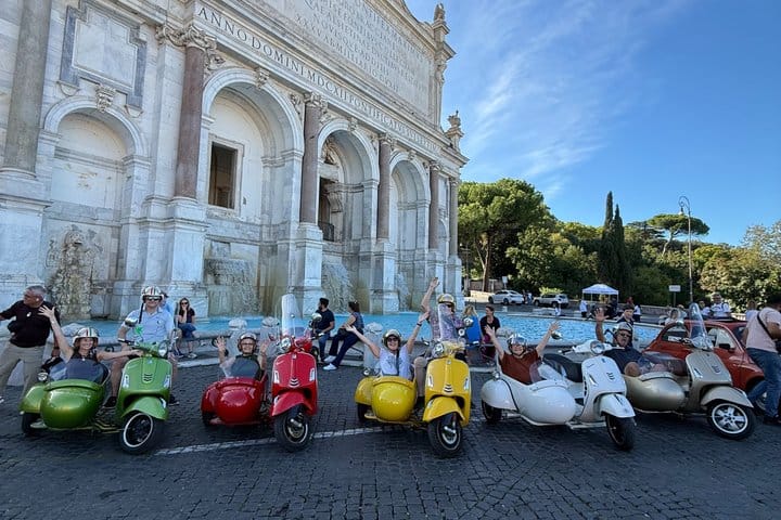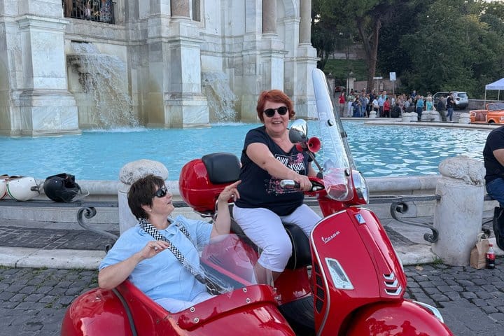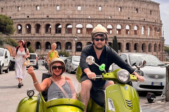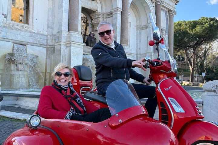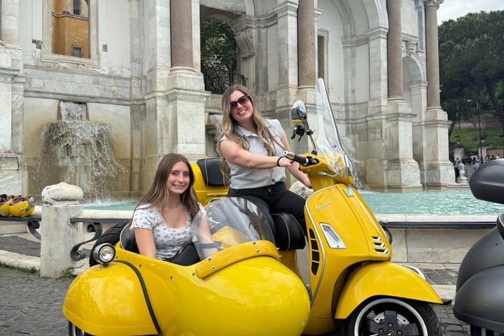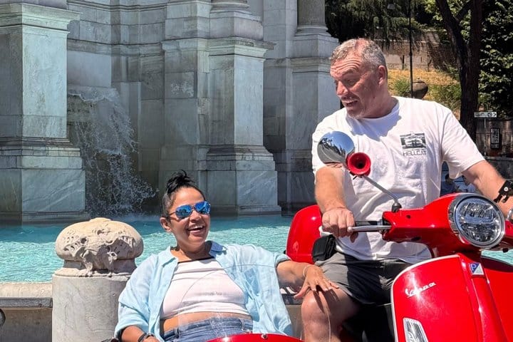 Join us for a unique adventure aboard a Vespa Sidecar! After the pickup from Piazza di San Pantaleo and then starting from the Colosseum and Monte Oppio, we’ll ride through Rome’s most iconic spots, offering stunning panoramic views. We’ll pass by Spanish Steps, Piazza del Popolo, Castel Sant'Angelo, and the Vatican. During the tour, we’ll make two stops: one at Pincho in Villa Borghese with a beautiful city view, and another at Fontana dell'Acqua Paola for a breathtaking view of Rome. We’ll also pass through Trastevere, Ponte Garibaldi, and the Altare della Patria, before returning to the Colosseum. A perfect tour to see all of Rome’s highlights in just 90 minutes!